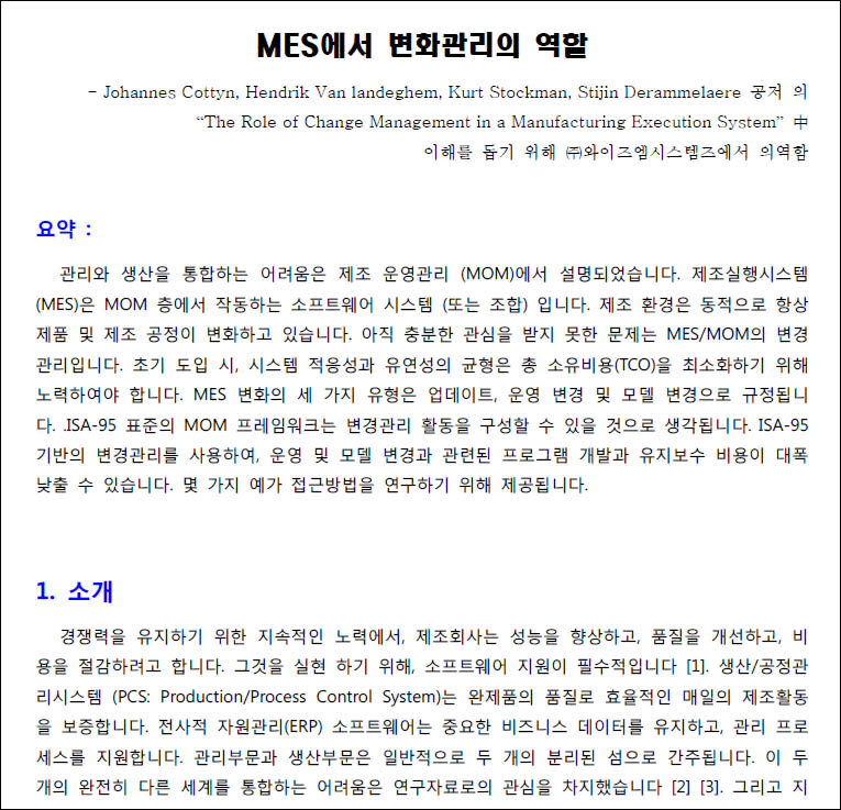 제조환경은 제품과 제조 공정 측면에서 항상 변화하는 동적인 성격을 가지고 있습니다. 끊임없는 MOM(제조운영관리)의 진화를 유도하고 있습니다. MES를 구축하는 작업은 크게 2가지로 나눌수 있는데, 첫번째는 변경 프로세스를 지원하는 것이고, 두번째는 성취한 개선을 관리하는 것 입니다. 즉, MES 도입 초기에는 총 소유비용(TCO)를 최소화하기 위해 적합성과 유연성간으 적절한 균형을 위한 노력이 필요하며, 이후에는 업데이트, 운영 변경, 모델 변경에 대응하여야 합니다. 이를 위해 ISA-95를 기반으로 하는 변경관리를 사용함으로써, 운영과 모델 변경과 코딩과 유지보수 비용을 대폭 낮출 수 있게 됩니다. 이러한 MES 내에서 변화관리의 역할과 중요성에 대해 연구한 논문을 소개합니다. 자료 일부~~